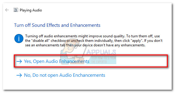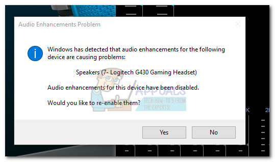 Note: There’s also another variation of this error message where users are prompted to re-enable audio enhancements instead of disabling them. This typically happens when the user has previously disabled audio enhancements from Control Panel and then ended up connecting an audio output device that is configured to use audio enhancements. In this particular case, hitting Yes at the prompt will most likely prevent the error message from appearing again. In the event that this prompt is re-appearing after hitting Yes, follow Method 4 to manually re-enable audio attachments.