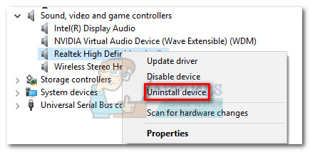 Note: If the search manages to identify a newer audio driver version, follow the on-screen prompts to apply the update. If not, continue with the steps below to re-install the audio driver. - Return to Sound, video and game controllers in Device Manager, right-click on the audio driver and choose Uninstall Device.