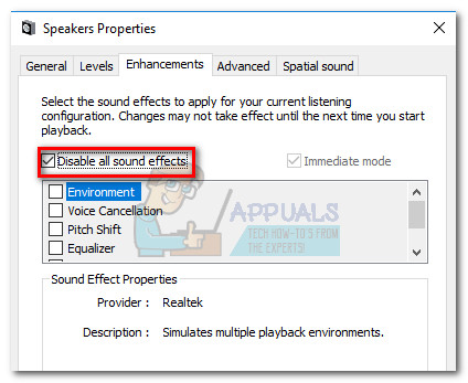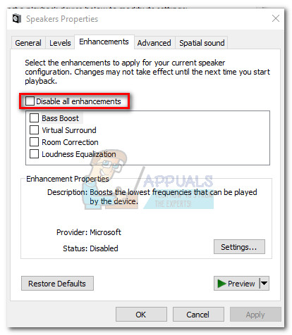 Microsoft and most third-party vendors are shipping audio enhancements packages designed to allow you to get the best possible sound from your hardware. However, depending on your configuration, you might find that these audio enhancements are causing various audio and sound problems if you have more than one sound output device. In some cases, users have reported that their system does not output any sound while audio enhancements are active – this typically happens on configurations that use a dedicated sound card.
