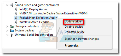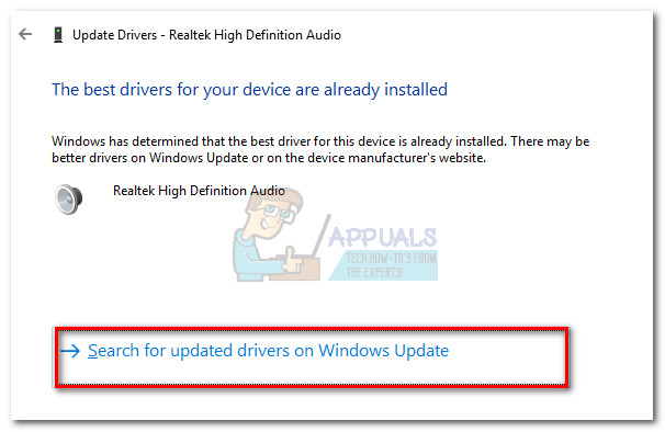Note: Depending on your PC configuration, you might find multiple drivers under Sound, video and game controllers. If you have a dedicated sound card, right-click on the driver associated with it. If you’re using an onboard sound card, right-click on the generic audio driver. - Click on Search automatically for updated driver software and see whether your sound driver get’s updated. If it doesn’t find a newer version, you can also use WU to search by clicking on Search for updated drivers on Windows Update.