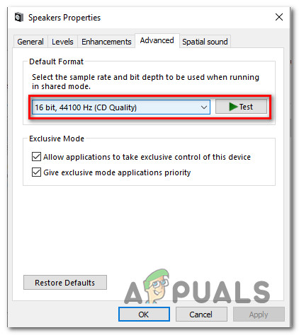 Accessing the properties menu of the Audio device triggering the error - Inside the Properties screen of your audio device, go to the Advanced tab and change the Default Format to 16 bit, 44100 (or a different standard format that you wish to use). Then click Apply to save your current configuration.