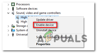 Disabling every audio device - Once all audio adapters under Sound, video, and game controllers have been disabled, wait a couple of seconds before re-enabling them by right-clicking and choosing Enable Device.