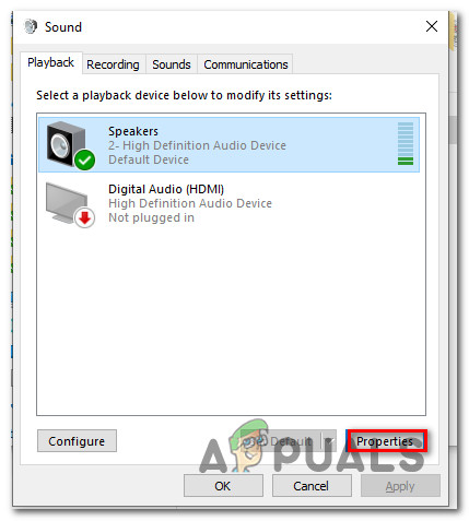Opening the Sound menu via a Run command - Inside the Sound menu, go to the Playback tab, select the audio device that you’re encountering the issue with, and click on Configure.