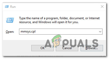 - Press Windows key + R to open up a Run dialog box. Then, type “mmsys.cpl” and press Enter to open the Sound settings menu.