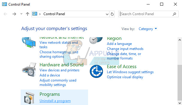 - Change the View by option to Category and scroll down to the bottom. Choose Uninstall a program under the Programs section.