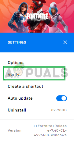 Clicking on the “Gear Icon” by the “Launch” Option inside the Fortnite tab. - Now select “Verify” and the game will begin to scan the game files.