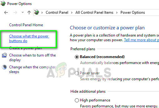 - Once in the Power Options, click on “Choose what the power buttons do” present at the left side of the screen.
