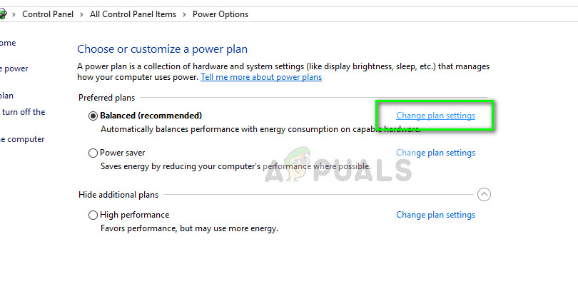 - Navigate back to the power options which we accessed earlier and click on “Change plan settings” present in front of the currently selected option.