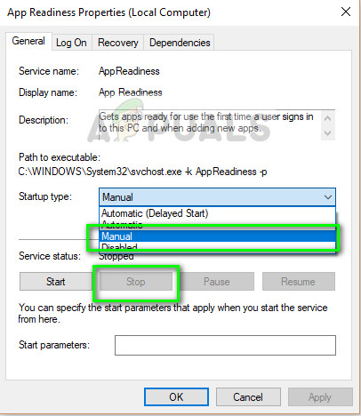 - Once in the properties, stop the service by pressing the “Stop” button present alongside Service status. Then select the startup type as “manual” instead of automatic. Press Ok to save changes and exit.
