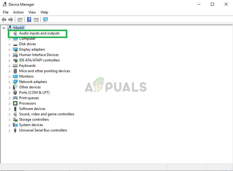 Searching for Device Manager - Now that you are in the device manager Click on Audio Inputs & Outputs.