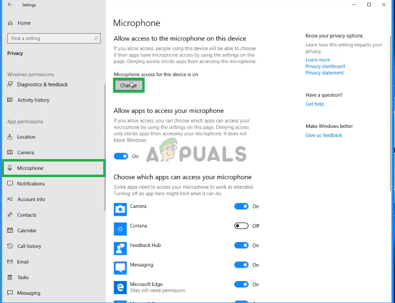 Opening Privacy Settings - From There Click on Microphone and then click on Change.