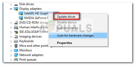 - In Device Manager, expand the drop-down menu associated with Display adapters. Then, right-click on your integrated graphics card and click on Update Driver.