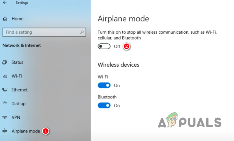 The first and easiest solution to this issue is to enable Airplane Mode on your system. When Airplane Mode is enabled, it disconnects all wireless connections from your system, including WiFi and Bluetooth. If you enable this mode and then disable it after a few seconds, it will effectively restart all your Bluetooth connections and will likely fix the issue.