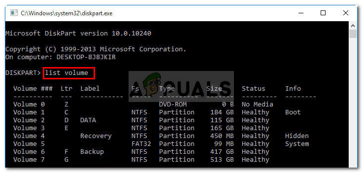 - Once you have loaded the diskpart utility, type in ‘list volume’.
