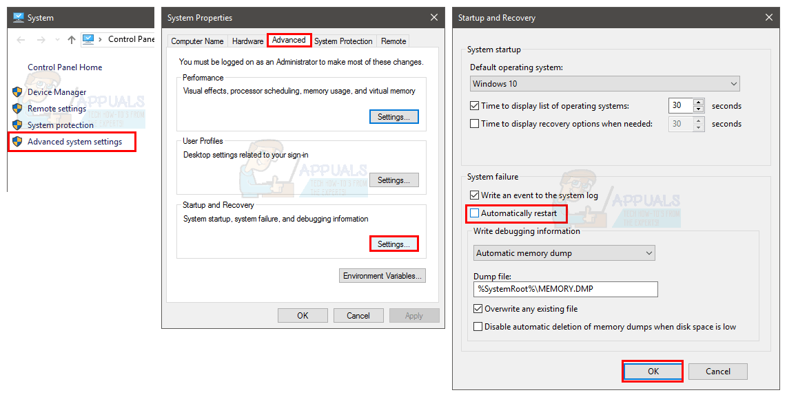 - Uncheck Automatic Restart under the section System Failure and press Ok