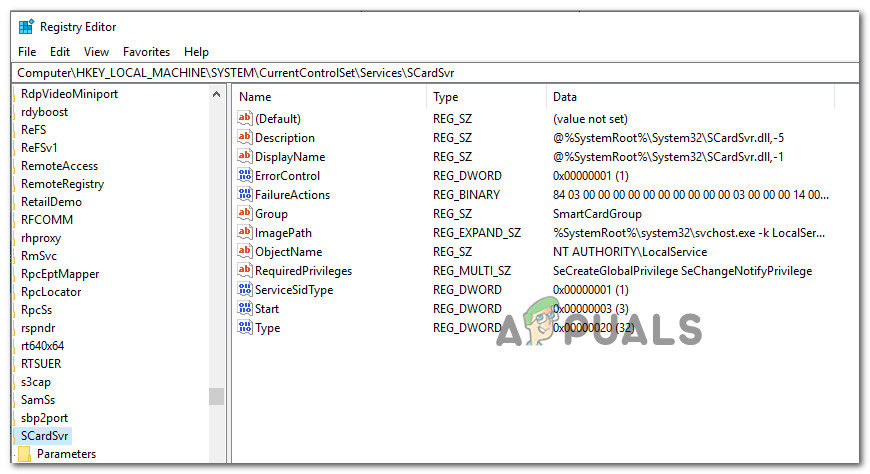 Navigating to the SCardSvr registry key Note: You can either navigate to this location manually or you can paste the address directly into the navigation bar.