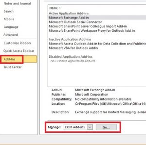 - Now click on the Add-ins tab to expand it. Expand the drop-drop down menu next to Manage (lower-side of the screen) and select COM Add-ins from the list.