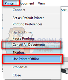 - Click on “Printer” present at the top-left side of the screen for the drop-down menu. Make sure that the option “Use printer offline” option is unchecked. In this case, the option is unchecked. Once you have made the changes, click “Cancel all documents” and try connecting your Canon printer again.