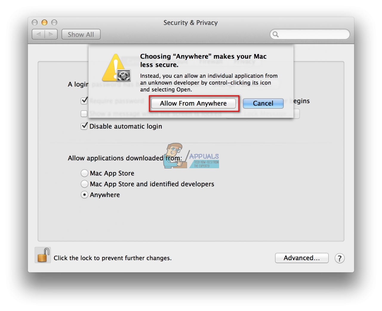 - Now, a popup window will appear, asking you to confirm your action. Click on Allow From Anywhere button.