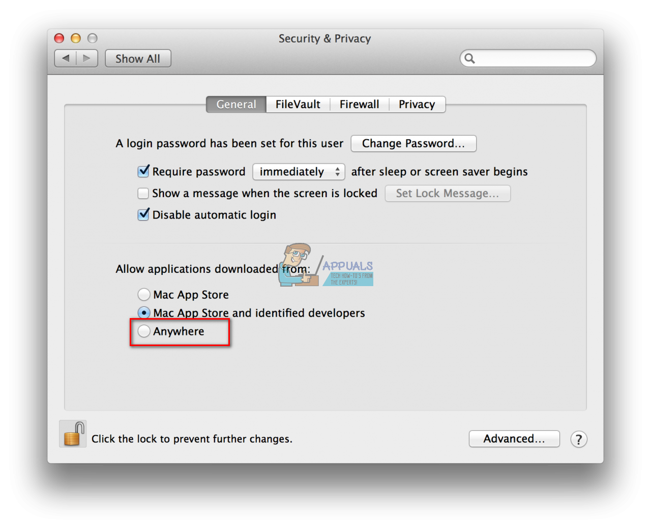 - In the Section “Allow applications downloaded from:” choose Anywhere. This will allow installing applications from all sources.
