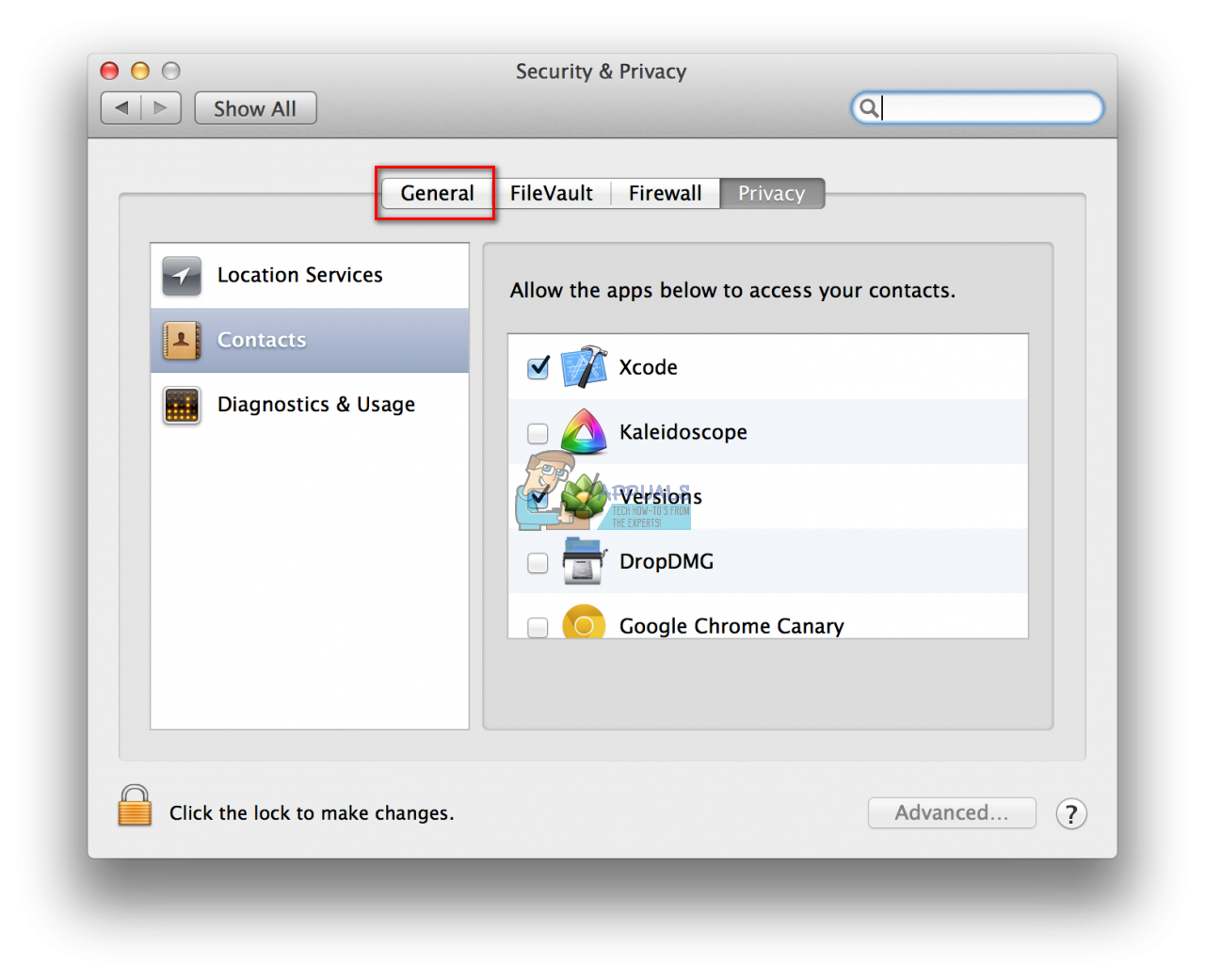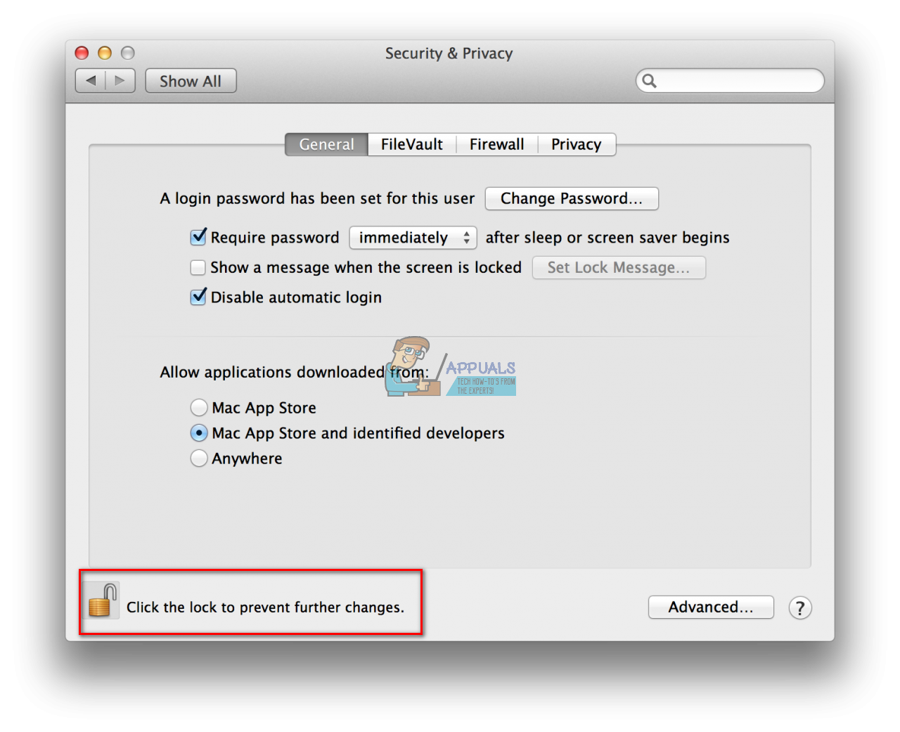 - Click on the General tab at the top of the Security & Privacy window.