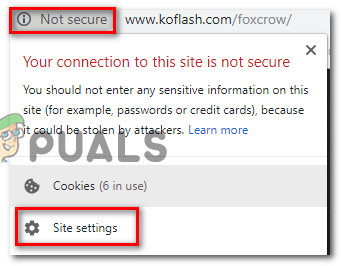 - Visit the website that contains flash content. Then, click on the Lock icon (info icon if the site isn’t secure) and click on Site Settings.