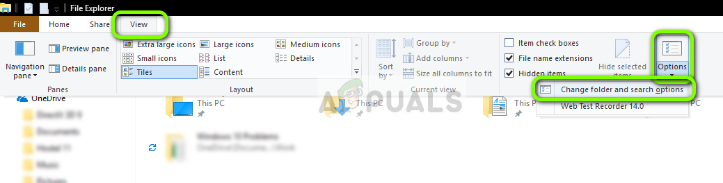 - Press Windows + E to access the Windows Explorer. Now click on View present at the top tab and then click on Options. Then select Change folder and search options.