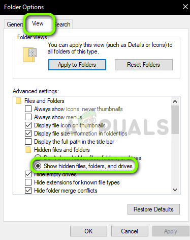 - Once in the settings, click on View and then select Show hidden files, folders and drives underneath the heading Hidden files and folders.