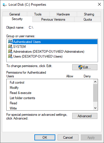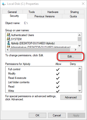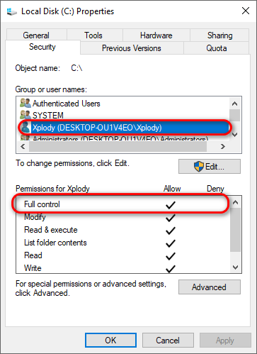 - Under Group or user names, check if your user account has Full Control.