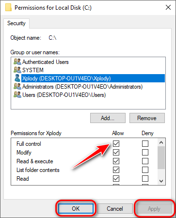 - Click on OK and now check the Full Control, hit apply, and OK.