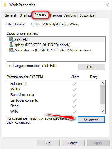 - Go to the Security tab > Click Advanced.