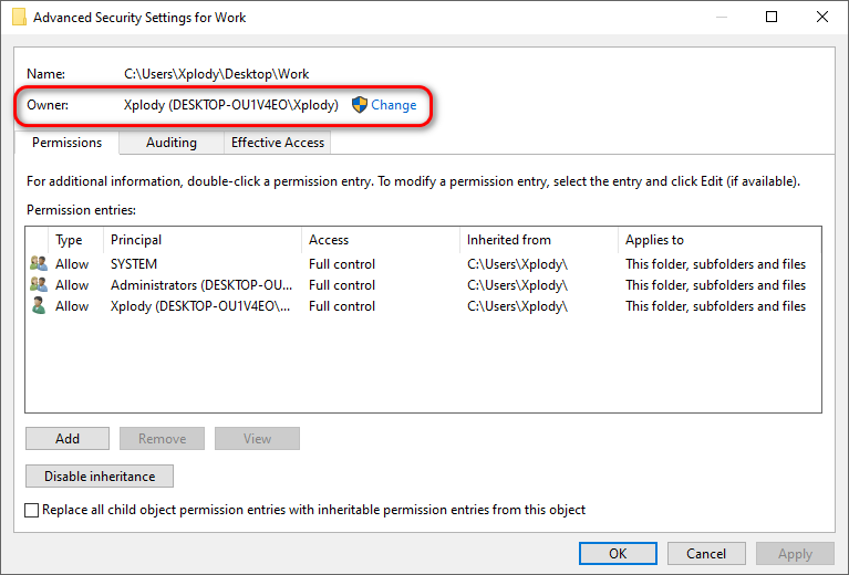 - In the advanced security settings window, find the Owner section at the top.