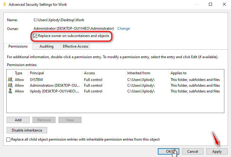 - Check the Box for Replace owner on subcontainers and objects.