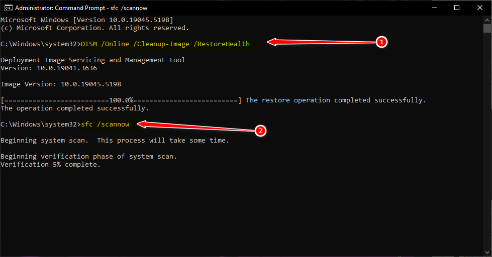If you’re still facing the issue, your system might have some corrupted files causing the error. Running a system scan using DISM (Deployment Imaging Service and Management) and SFC (System File Checker) can help detect and repair these corrupted files.