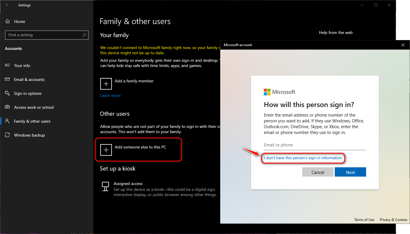 - Click Add someone else to this PC. It will redirect you to a new screen. Click “I Don’t have this person’s sign-in information” and click Next.