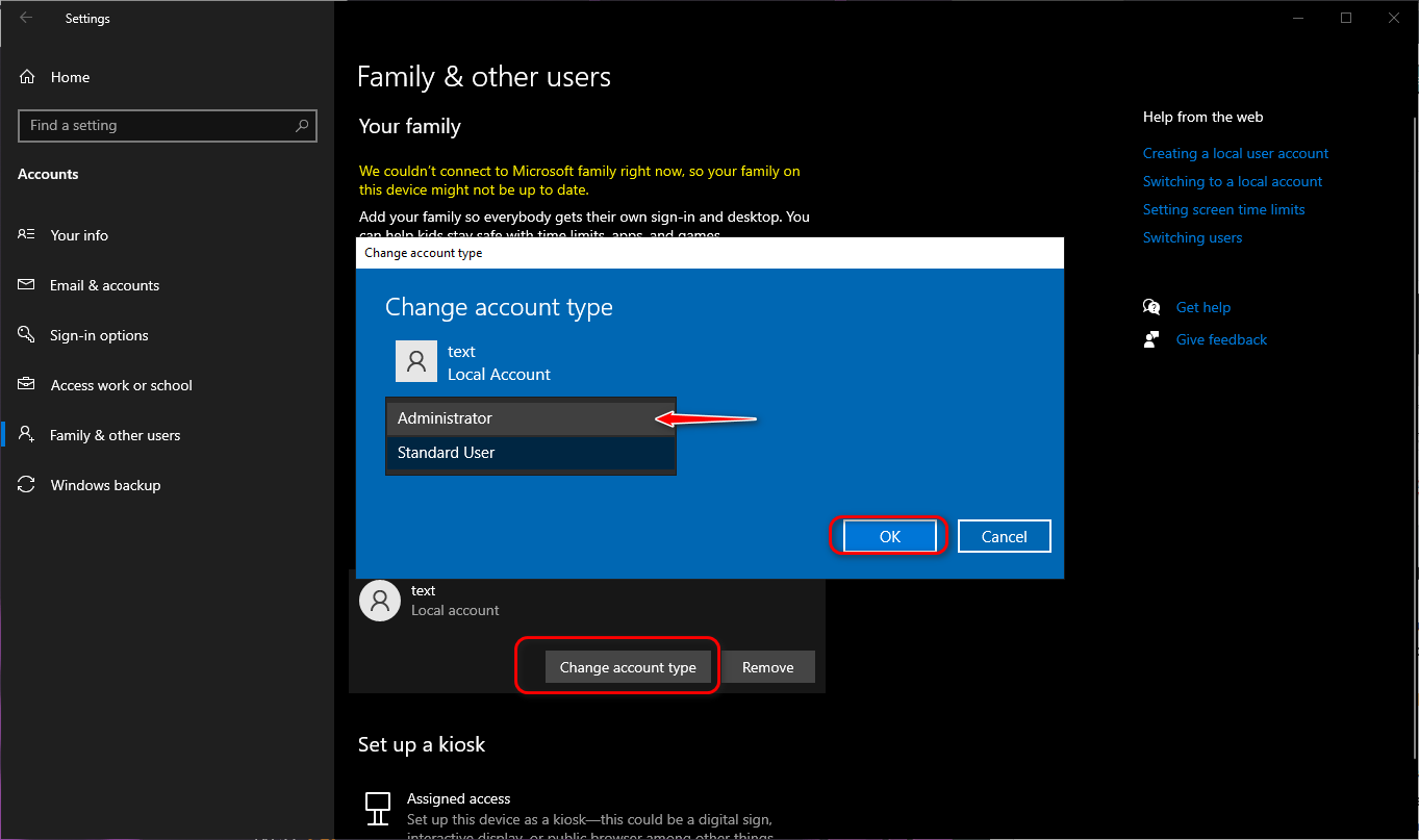 - Once the account is created, click on “Change account type” and set it to Administrator.