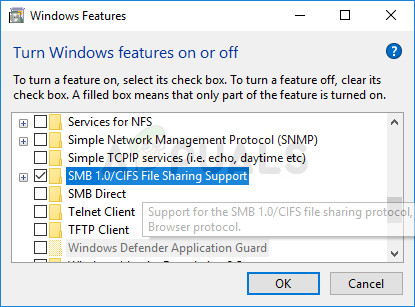 In order for the process to succeed, there are several components that absolutely need to be installed properly on your computer. One of these components is definitely SMB 1.0/CIFS File Sharing Support which is a built-in component that is turned on by default on some computers and disabled on others. You should definitely check if the process is enabled on your computer by following the instructions below: