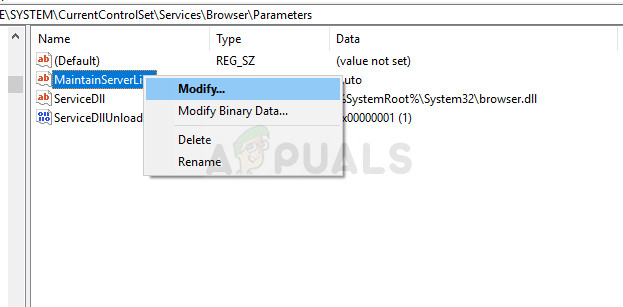 - Change the value of MaintainServerList from Auto to Yes by right-clicking on it, choosing the Modify option, and typing Yes in the Value data field.