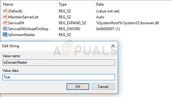 - Locate the IsDomainMaster value and change its value to True in the same manner. If this key is not available in this location, right-click anywhere at the right side of the Registry Editor’s window, select New >> String Value and name it IsDomainMaster. Right-click on it, choose Modify and set its value to True.