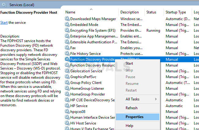 It is possible that your computer might’ve automatically configured some services to be disabled at startup and due to this, your network discovery function on the computer might not work properly. Therefore, in this step, we will be reconfiguring these services from the services management window and then we will check if doing so fixes this issue. For that:
