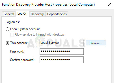 “Windows could not start the Function Discovery Provider Host service on Local Computer. Error 1079: The account specified for this service differs from the account specified for other services running in the same process.”