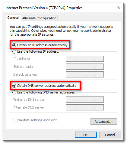 Configuring Windows to obtain IP and DNS Automatically for IPv4 - Make sure to check this option for both the IP address and the DNS server so that your computer uses automatic DNS detection.
