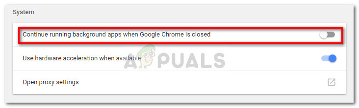 - In the Advanced section, scroll down to the System section and uncheck the toggle associated with Continue running background apps when Google Chrome is closed. Once the setting is disabled, you can safely close Google Chrome.