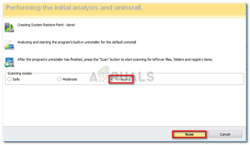 - Once the uninstallation is complete, return to the Revo Uninstaller screen and choose Advanced under Scanning modes, then hit Scan.