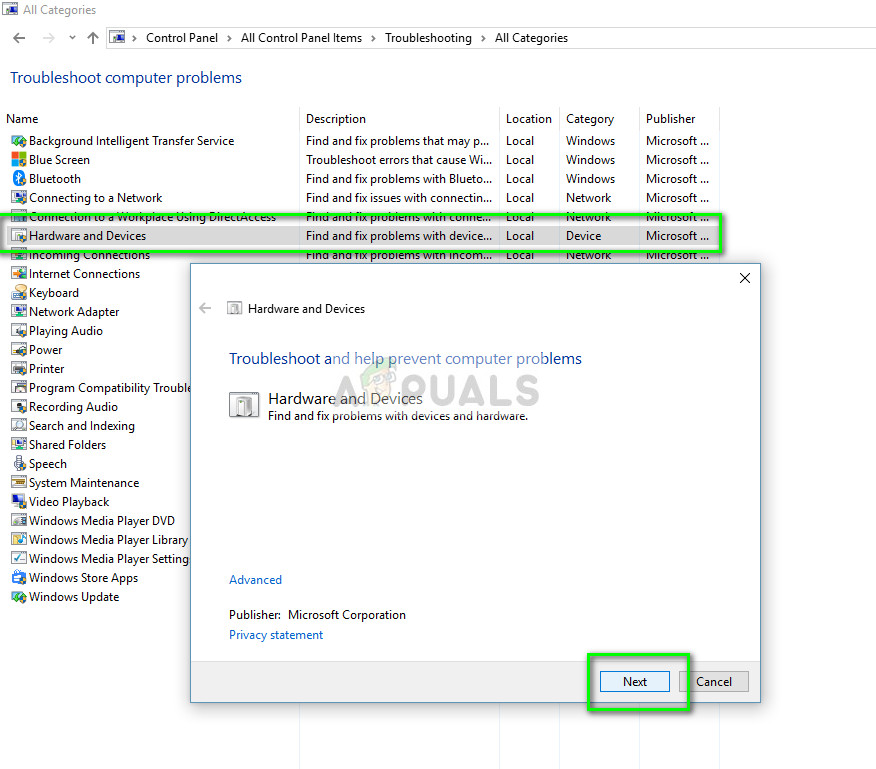 There have been numerous positive responses by users who used the hardware and devices troubleshooter to solve the issue. This method will solve any issues while connected to your device to cast media or sometimes, even fixes the configuration of your sharing mechanism. Perform this step before moving forward.