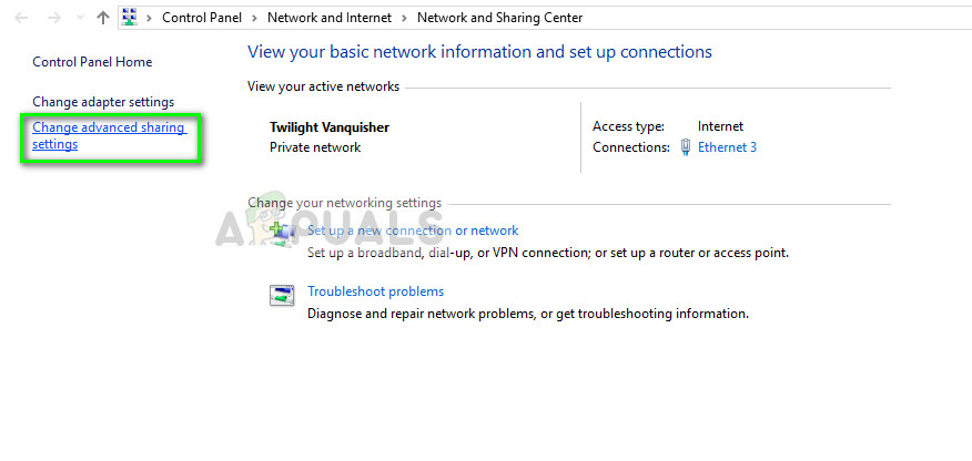 - Click “Change advanced sharing settings” from the left navigation pane.