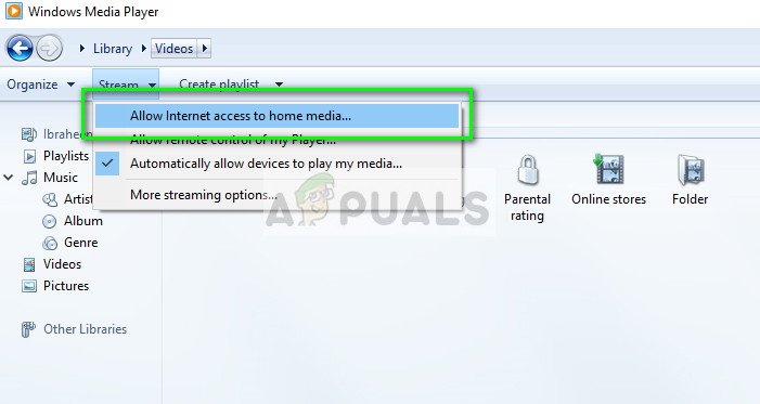 - Once the media player is opened, click on Stream > Allow Internet access to home media.
