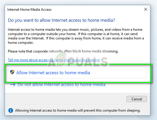 - An UAC will pop up asking you to confirm your actions. Press Allow Internet access to home media.