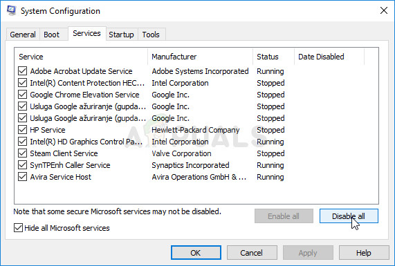 - Under the Services tab, click to select the Hide all Microsoft services check box, and then click ‘Disable all’.