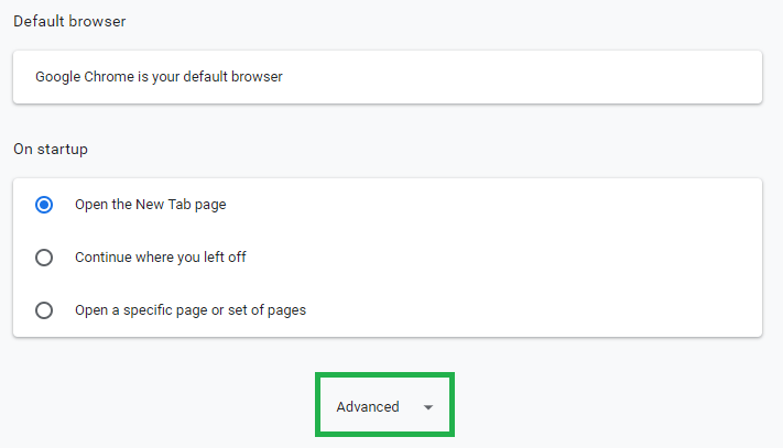 Menu button Chrome - In the settings, scroll all the way down and click on “Advanced”